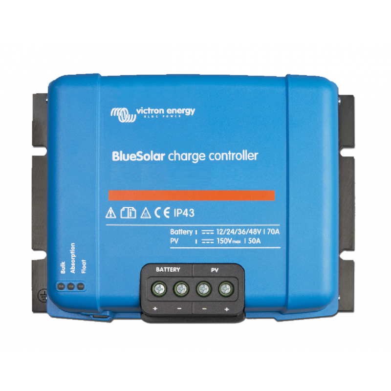 SCC125070421. Voltaje máximo 250Vdc, intensidad máxima 70A. Producción paneles permitidos: 12v 945w - 24v 1890w - 48v 3850w. Bluetooth integrado. Compatible con Smartsolar Pluggable Display