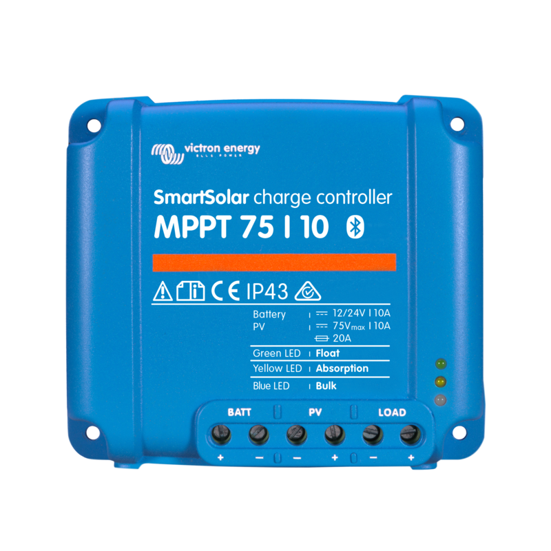El SmartSolar MPPT 75/10 actúa como un cargador solar inteligente que ajusta de forma continua la tensión de los paneles para trabajar en el punto de máxima potencia (MPPT) y cargar la batería con la corriente adecuada.