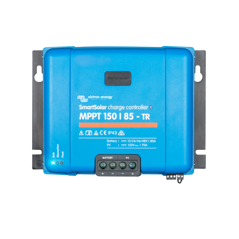 Regulador de carga solar MPPT de alta corriente con comunicación VE.Can para bancos de baterías de 12, 24, 36 o 48 V, capaz de trabajar con campos fotovoltaicos en serie de hasta 150 V en circuito abierto y suministrar hasta 85 A de carga a la batería.