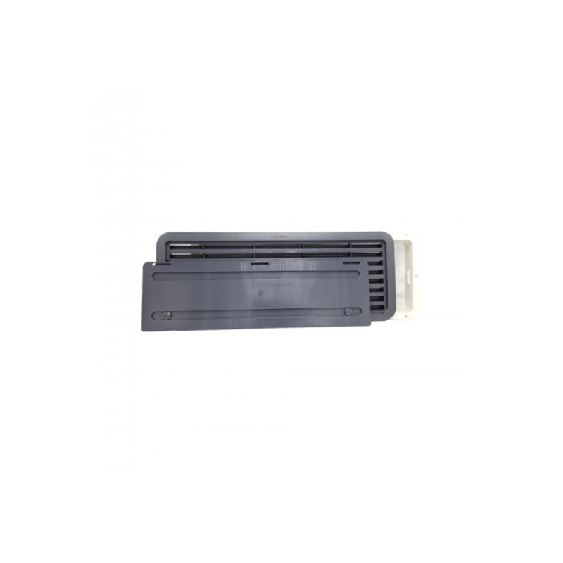 Rejilla de plástico encastrable para ventilación con mosquitera. Características: Dimensión exterior: 370 x 223 (largo x ancho mm). Encastrado: 335 x 185 (largo x ancho mm). Profundidad: 20 mm. Color: Blanco.