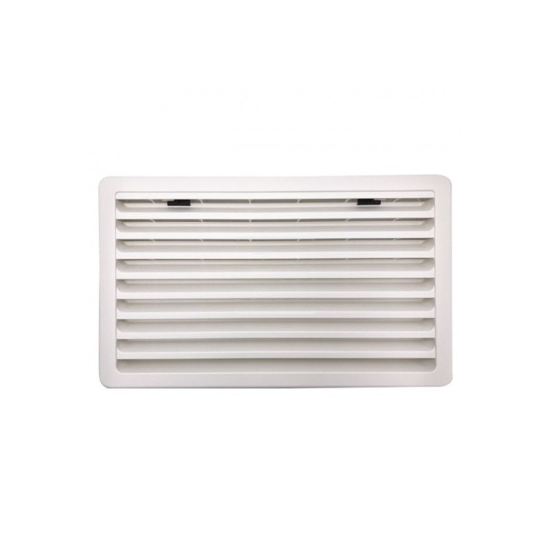 Rejilla Plástico Ventilación 430 x 230 Rejilla de plástico para ventilación con mosquitera. En color blanco. Dimensiones: 430 x 230 (largo x ancho mm).