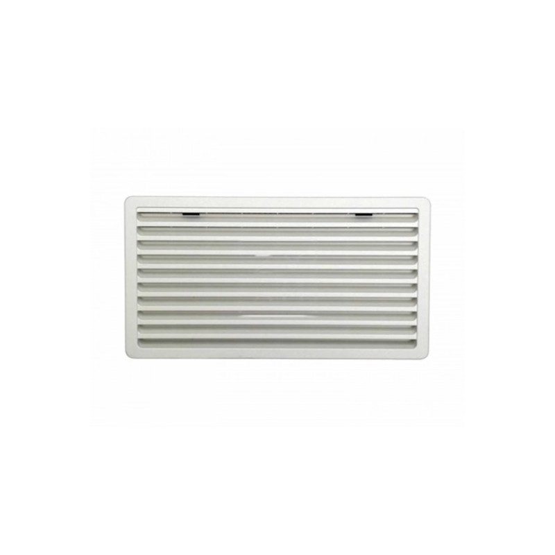 Rejilla de plástico encastrable para ventilación con mosquitera. Características: Dimensión exterior: 370 x 223 (largo x ancho mm). Encastrado: 335 x 185 (largo x ancho mm). Profundidad: 20 mm. Color: Blanco.
