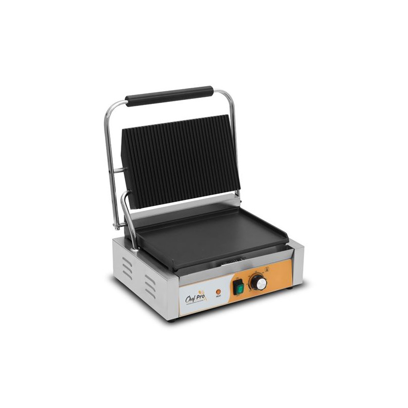 • Grill eléctrico profesional CHEF PRO con placas superior e inferior combinadas: media superficie rayada y media superficie lisa. Ideal para preparar paninis, sándwiches, carnes, pescados y verduras con marcas de parrilla y cocción uniforme.