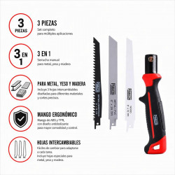 . Pack: 16 unidades.. 1 x Sierra corte fino y curvo para madera: 12 dientes/pulgada y 50 mm longitud de corte.. 2 x Sierra corte fino para madera: 10 dientes/pulgada y 75 mm longitud de corte.. 3 x Sierra multiusos corte uniforme: 10 dientes/pulgada y 60 mm longitud de corte.. 2 x Sierra corte rápido para metal: 14 dientes/pulgada y 50 mm...
