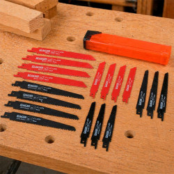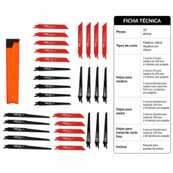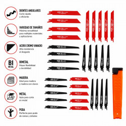 . Pack: 16 unidades.. 1 x Sierra corte fino y curvo para madera: 12 dientes/pulgada y 50 mm longitud de corte.. 2 x Sierra corte fino para madera: 10 dientes/pulgada y 75 mm longitud de corte.. 3 x Sierra multiusos corte uniforme: 10 dientes/pulgada y 60 mm longitud de corte.. 2 x Sierra corte rápido para metal: 14 dientes/pulgada y 50 mm...