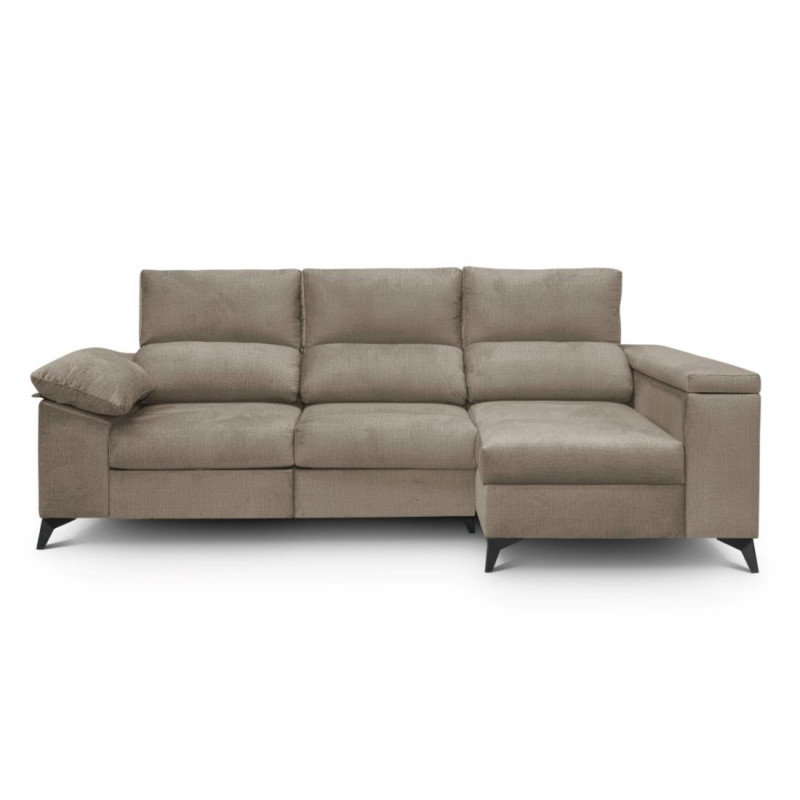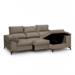 Sofá modelo Hugo con arcón de almacenamiento en brazo y chaiselongue. Incluye asientos deslizantes con ruedas al suelo y respaldos reclinables que podrás ajustar para una mayor comodidad. L265 x F145 x A105 cm
