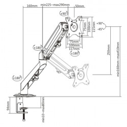 Se adapta a pantallas planas de 17' a 32'./ Rotación del soporte: 360º/ Rotación de la pantalla +180º -180º/ Inclinación arriba/abajo: +15º · -15º/ Grosor de la superficie sugerida: 10 - 75mm/ Organizador de cables/ Altura máxima: 399mm/ Peso Soportado: hasta 8Kg por monitor/ VESA 75x75, 100x100