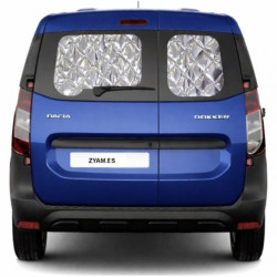 Conjunto completo de oscurecedores térmicos de 9 capas, diseñado a medida para aislar la totalidad de las ventanas (9 en total) en vehículos Dacia Dokker y Renault Express equipados con puertas traseras de doble hoja. Este sistema de aislamiento es un elemento fundamental para garantizar la habitabilidad y el confort en el interior de su furgoneta camper, protegiendo el habitáculo de las temperaturas extremas tanto en invierno como en pleno verano.