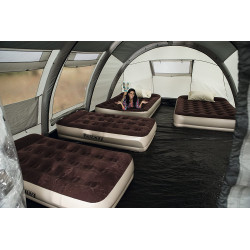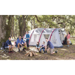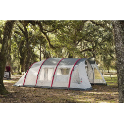 La tienda de campaña dispone de 3 cabinas para dormir y una sala de estar para relajarse o jugar juntos. Múltiples ventanas dejan mucha luz en la tienda, por lo que la lectura en el interior no es un problema.