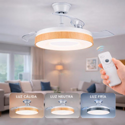 • Este ventilador de techo combina funcionalidad y estilo, sus aspas retráctiles permiten ocultarlas fácilmente, una ventaja frente a otros ventiladores tradicionales de techo. • Integra una lámpara plafón capaz de iluminar ampliamente la estancia. • Luz ajustable 2.700K - 4.000K - 6.500 K (luz cálida-neutra-fría). • Seis velocidades. • Temporizador. •...