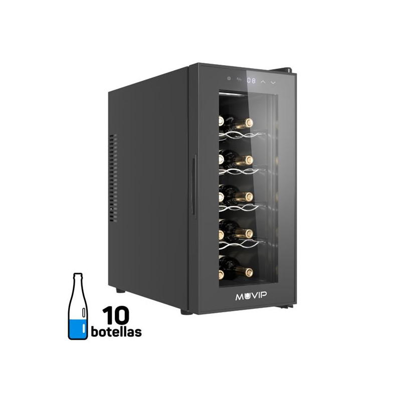 VINOTECA 10 BOTELLAS - MUVIP MV0535, 28 LITROS, CLASE F, 95W, ALTO 56, ANCHO 26,5, FONDO 51,5 CM, COLOR NEGRO.